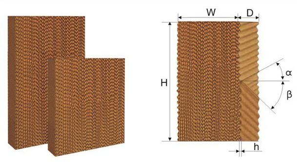 4、按波纹夹角可分为45度+45度、30度+60度、45度+15度,水帘纸的型号有5090、5060、7090、6090、7060、9090、9060。降温水帘常用的型号是7090,根据不同需要也可以制作成其他型号。